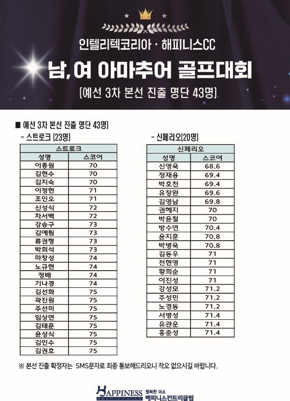 인텔리텍코리아,해피니스CC 남,여 아마추어 골프대회(예선 3차 본선 진출 명단)